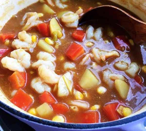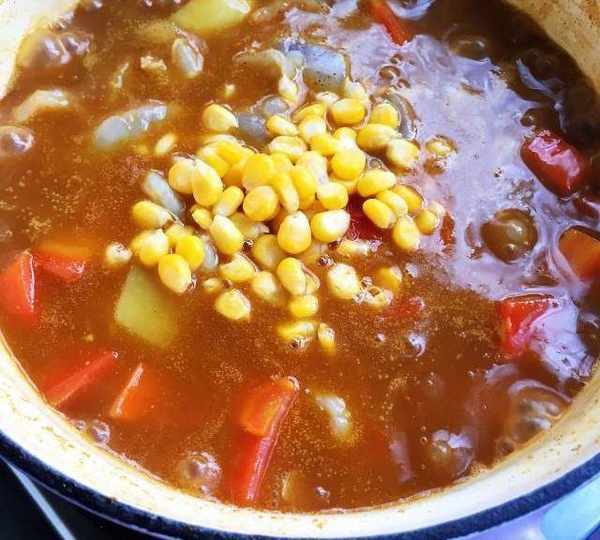 第11步、土豆八成熟放入蝦仁和玉米粒。