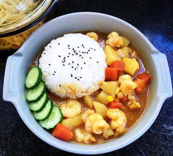 原料:大米、青蝦、紅蘿卜、小土豆、黃瓜、玉米粒、蔥、蒜、咖喱塊、油、鹽、醬油、開水、黑芝麻、黑胡椒粉、淀粉。