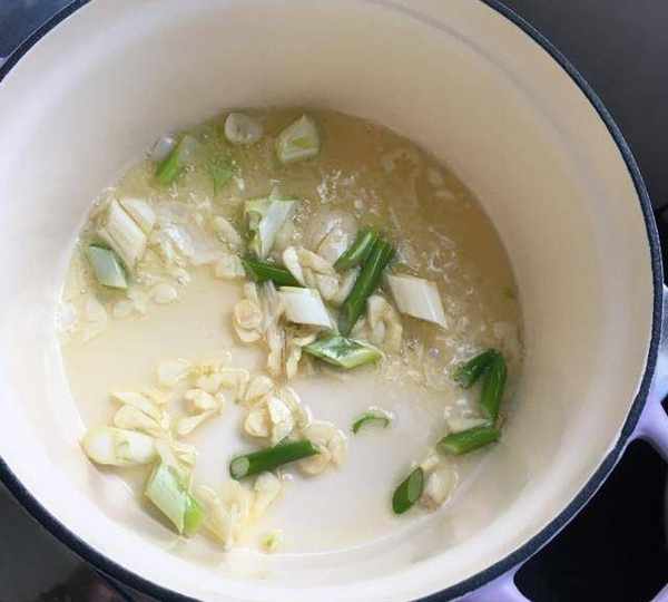 第7步、琺瑯鍋預熱入油,放入蔥蒜爆香。