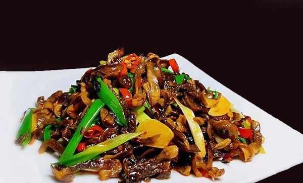 起鍋燒熱油,下入薑片和泡椒段炒出香味,下入鹿茸菇炒幹水分,加入老幹媽、生抽、老抽調色。