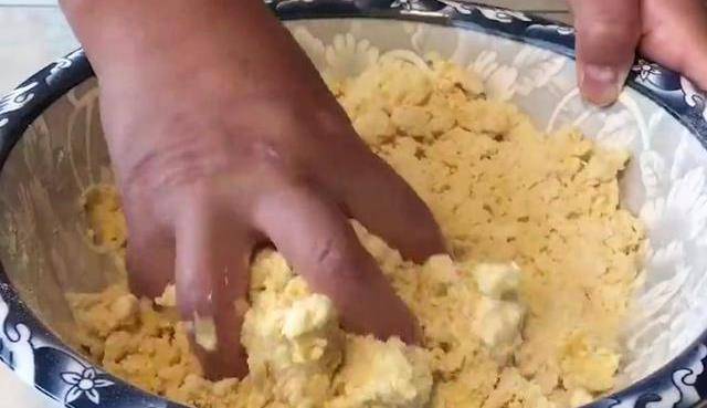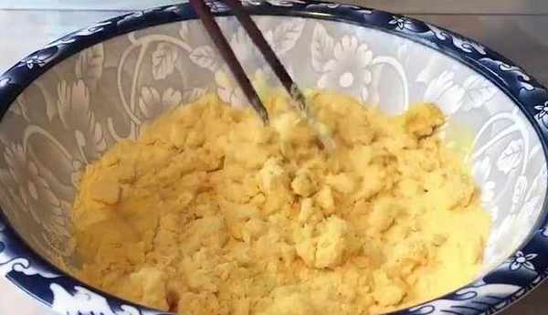 今天我們用玉米面來做個美食,首先盤中準備一碗玉米面,然後再準備一碗剛剛燒開的開水,用開水燙面,燙過的玉米面吃起來會更加的細膩好吃,攪拌成顆粒狀。放置溫熱的時候打入兩顆雞蛋。雞蛋大約重128克左右,用筷子攪拌均勻,再加入4克酵母,加入兩碗的普通面粉,攪拌均勻,攪拌成面絮狀,再下手稍微整理成這樣的面團,這面團是非常粘手的,直接蓋上蓋子發面。發成這個狀態就可以瞭。