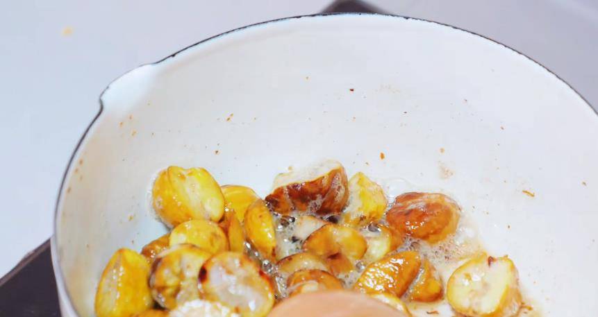 5、 將燉好的板栗用開大火收汁,當汁水變得少且粘稠時盛出。