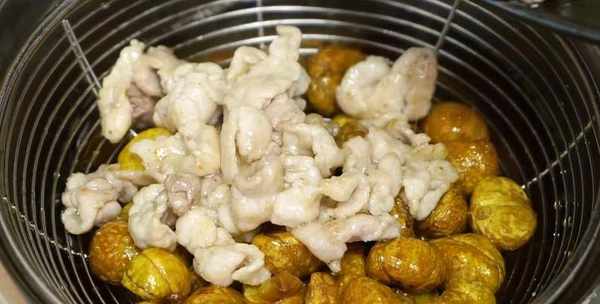 5、 另起一個鍋,倒入一大勺油,倒入板栗與豬肉片炸香後撈出。