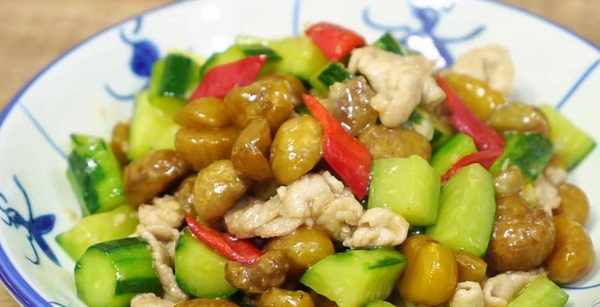 4、 燒一鍋開水,放入黃瓜焯燙30少後撈出;再倒入板栗,煮5分鐘後撈出,瀝幹水分。