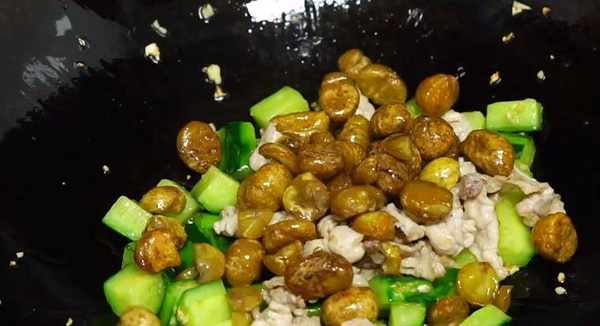 6、 鍋內放入蒜末,倒入板栗與豬肉片,加食鹽、雞精,蠔油翻炒均勻後,倒入芡汁翻炒盛出。