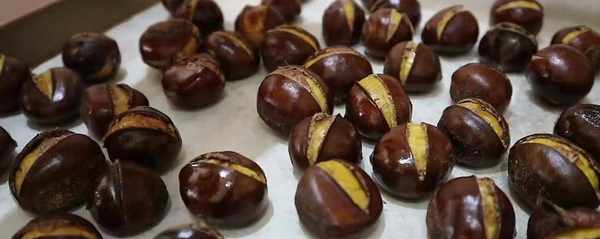 4、 板栗烤到開口後,將板栗取出,在開口處刷上一層糖水,再將板栗放入烤箱,繼續烤5分鐘。