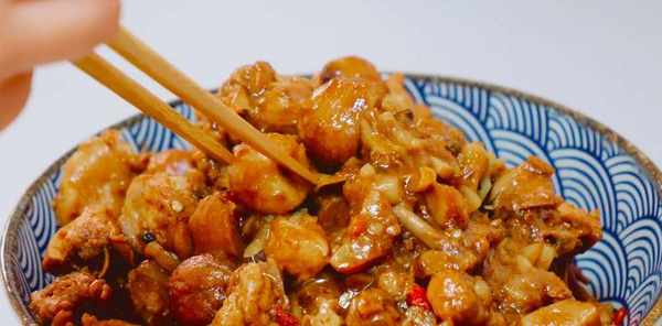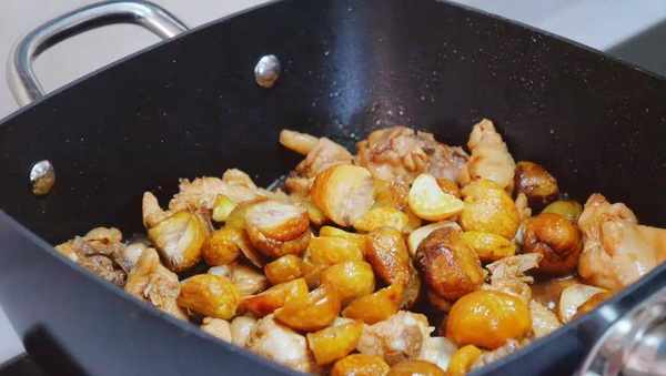 4、 另起一個鍋,倒入少量的油,加蒜片、薑片、幹辣椒、花椒、大料炒香,倒入板栗與雞肉,加清水沒過,再放食鹽、生抽、料酒、蠔油、冰糖調味,大火煮沸後轉小火燉30分鐘。
