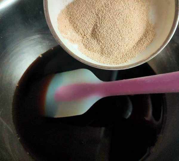 第6步、紅糖水30_40度的時候倒入幹酵母,用刮刀攪拌均勻。