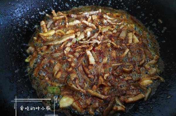 3.豬肉絲炒熟後放入蔥薑蒜提香去腥,鍋中炒出蔥香味後,再放入少量的老抽上色,老抽最好選用冰糖老抽,因為冰糖老抽上色不黑。