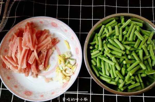 1.食材準備:豆角摘頭去尾,剔除老筋,切成小段,豬肉洗凈後切成肉絲,大蔥切蔥花,蒜瓣切片,生薑切絲。