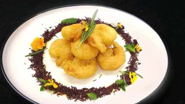 脆漿粉放入海苔一起調開備用,紫薯改刀切成絲炸至變脆,壓碎擺盤。
