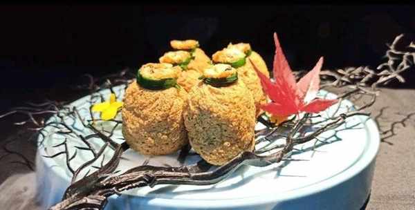 把所有切成丁的原料加入沙拉醬拌勻,放上醃制好的魚籽裝入掏空的福袋中,用蔥結紮好即可。