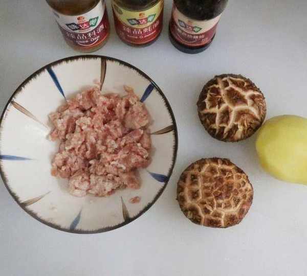 第1步、準備主要食材:土豆一個,香菇兩朵,豬肉餡100克。