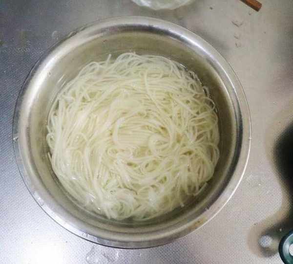 第9步、煮熟以後撈入溫熱開水中過一下,目的拌出來的面不黏,爽口。