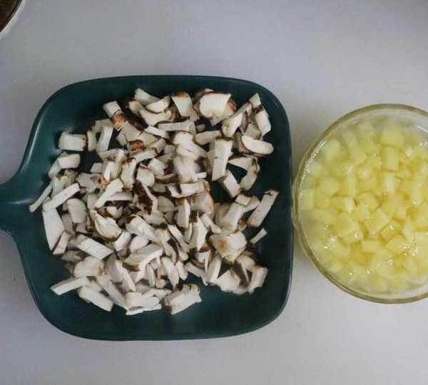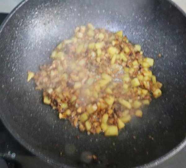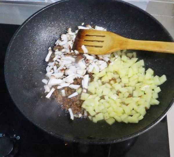 第6步、倒入土豆和香菇丁翻炒,煸炒到香菇和土豆丁變軟,加入少量的清水,放鹽,白胡椒粉調味。