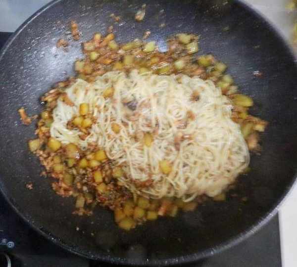 第10步、然後把過水的面撈入土豆肉沫菜中,抄拌均勻就可以瞭。