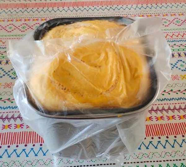 第5步、發酵瞭百分之八十停機瞭,我將面包桶覆蓋塑料袋放置南窗臺,不一會就發酵完成。