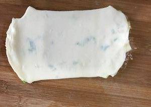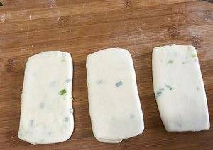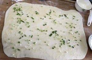 把面團拿出,搟成長方形薄片,塗上油面糊,撒上青蔥粒。