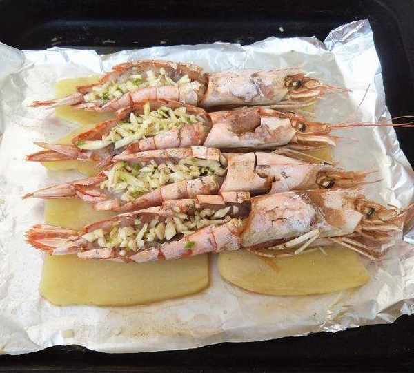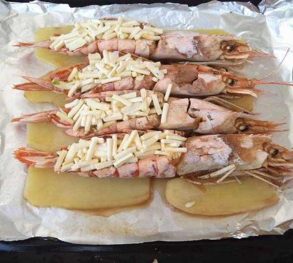 原料:阿根廷紅蝦、芝士、土豆、大蒜、鹽、料酒、胡椒粉。