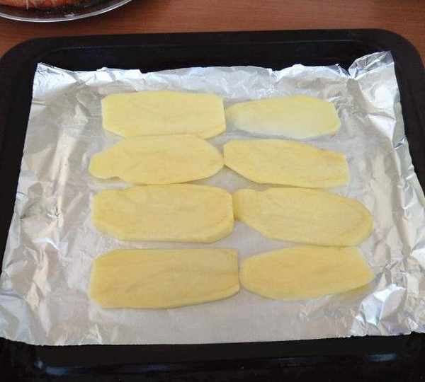 第7步、土豆去皮去片放入鋪有錫紙的烤盤。