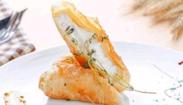 取不粘鍋把鱈魚煎至上色,把酥皮切至正好的大小進行加工封口,畫線再用烤箱200度烤5分鐘裝盤,用黑醋汁畫線撒上海鹽裝飾