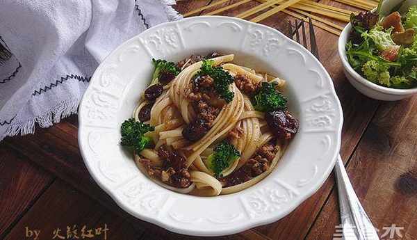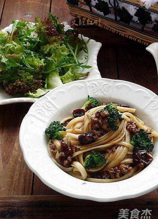 10、盛起蔓越莓肉醬意大利面,放進西蘭花,即可食用