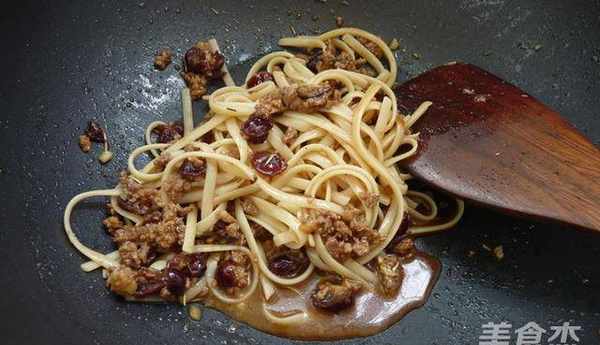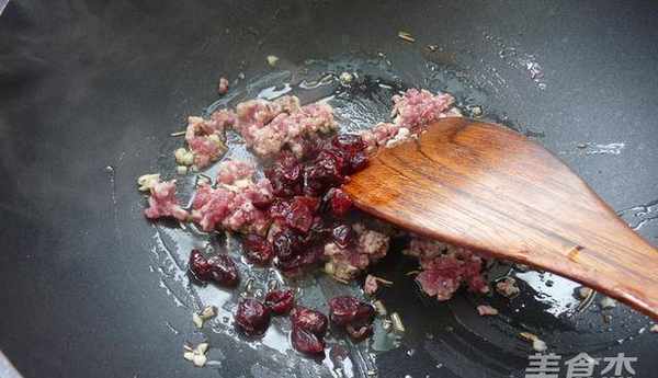 6、下牛肉末炒至轉色,下蔓越莓幹