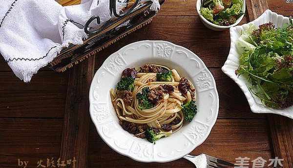 初榨橄欖油:3大匙意大利面:60克蔓越莓幹:30克牛肉末:3匙西蘭花:20克蒜:3克