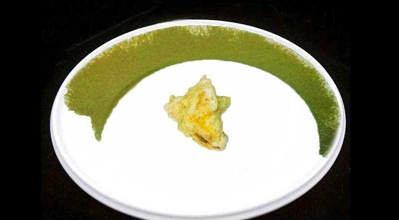 控油後的榴蓮天婦羅擺盤,邊上撒上抹茶粉點綴即可。