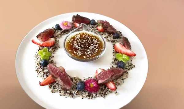 藜麥裝盤牛肉切成條擺盤,點綴草莓、藍莓、綠繡球配上醬汁即可