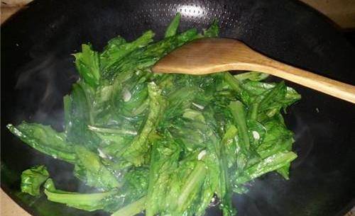 第四步:爆炒的途中咱們不需要復雜的,切換火候的大小,等到油麥菜完全炒熟瞭以後,順著鍋邊淋入適量的熱水,咱就可以洗個幹凈的盤子,起鍋裝盤啦。