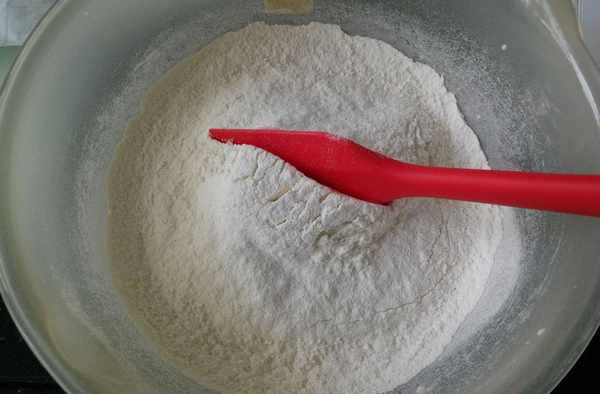 2.將鹽,泡打粉和低筋面粉混合後篩入煉乳蛋黃液中。