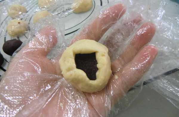 6.將每份小面團壓扁,包入一份豆沙餡,收口。