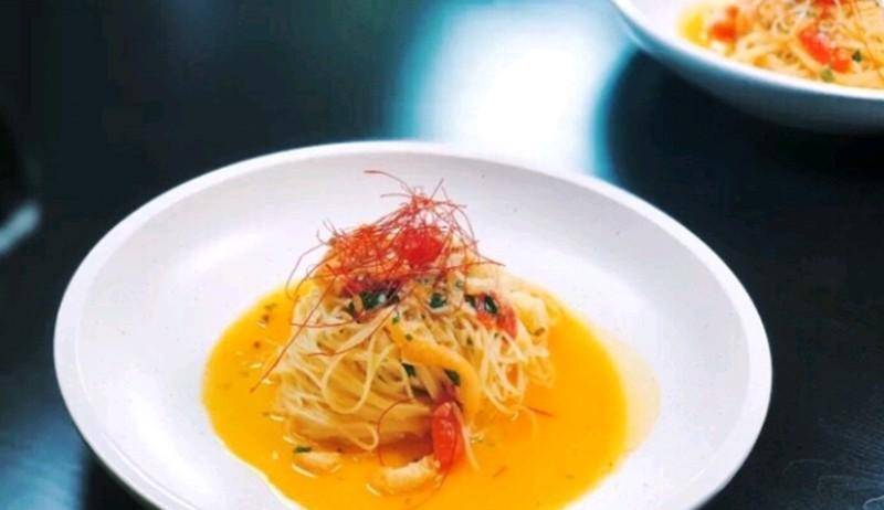 細面、紅花、草蝦、黃油、百裡香、海鮮湯、冬蔥、蒜、鹽、橄欖油、白胡椒粉、白葡萄酒