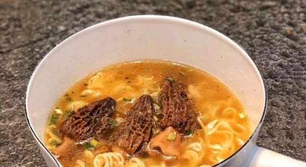 辛拉面、羊肚菌、牛肝菌、火腿、蔥花、鹽、黑胡椒粉