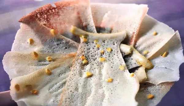 制作; 1.選小麥面粉加老面、清水300克、雞蛋、鮮玉米粒順同一方向攪勻,蓋保鮮膜餳發半小時。2.鐵鍋燒熱,抹一圈黃油,待鍋內溫度升至五成熱,將調好的面漿30克用勺子,從鍋邊依次倒入,面團會順著鍋邊緩緩向下攤開,然後每隔5厘米放一塊面漿,待將一鍋全部鋪滿時,小火慢煎,待面漿和鐵鍋分離且底部煎至香酥,裝入盤中即可。