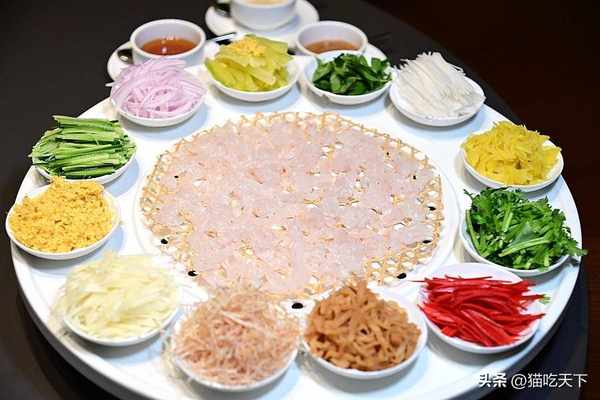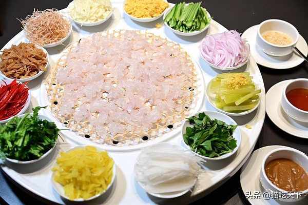 潮汕魚生,這是必吃的經典美食,大大一盤霸氣十足,中間是色澤粉嫩晶瑩剔透的魚生,真材實料份量十足,邊上是各種可以添加的配料,根據自己的口味選擇。