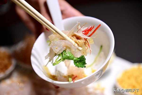 把魚生和配料、調料充分攪拌,一同送入口中,魚肉的柔嫩鮮甜和各種配料的滋味完美融合,細細品嘗,後會無期,果然經典!