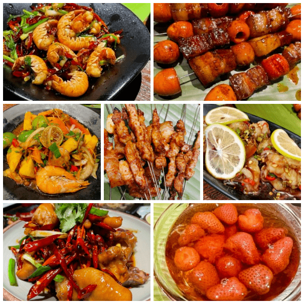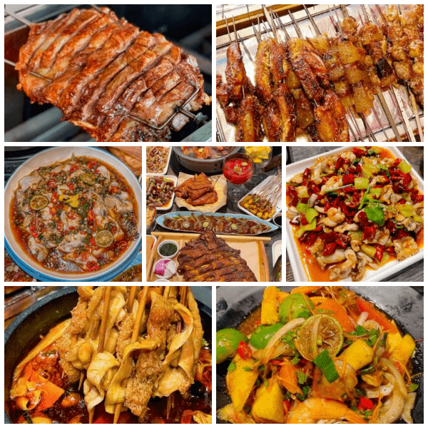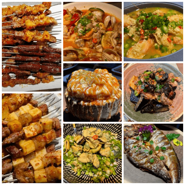 各種的烤串以及佐酒菜品,牛蛙愛上小海鮮,烤半條黃花魚、四味生蠔、青麻椒海鮮鍋、辣炒小鮑魚、火肆拌豬皮。麻辣燙、芝士雞蛋糕······