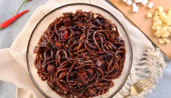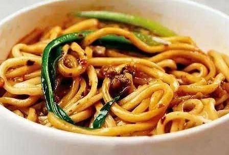 4. 將面條撈出瀝幹,放入調料碗中,再舀上芽菜素肉末末即成。