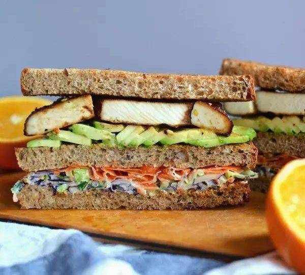 先把豆腐的表皮煎得脆脆的。然後,把煎好的豆腐、蔬菜和牛油果一起夾在吐司裡面,就可以開動啦。春醬炸醬面