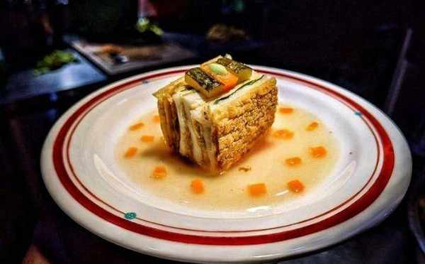 選用底部稍為高點的盤子,放入一勺芡汁,擺上煎好的豆皮千層後,接著擺上醃制黃瓜和芥末即可