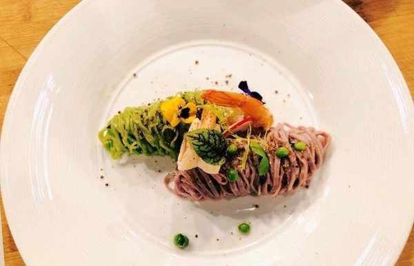 龍蝦汁過濾後加入油面增加濃稠度,用黃油分別炒龍蝦揉和大蝦揉,菠菜面和紫甘藍面加入龍蝦汁裝盤