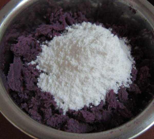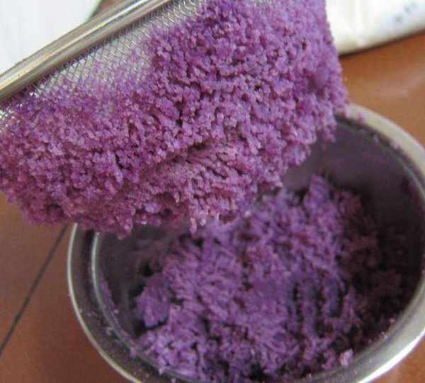 第1步、紫薯蒸熟,放涼,去皮,搗成紫薯泥。為瞭紫薯泥更細滑,所有紫薯泥過篩。