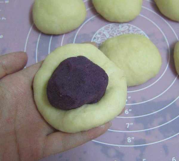 第7步、把包好紫薯餡的面團收口向下,用搟面杖搟成扁圓形。
