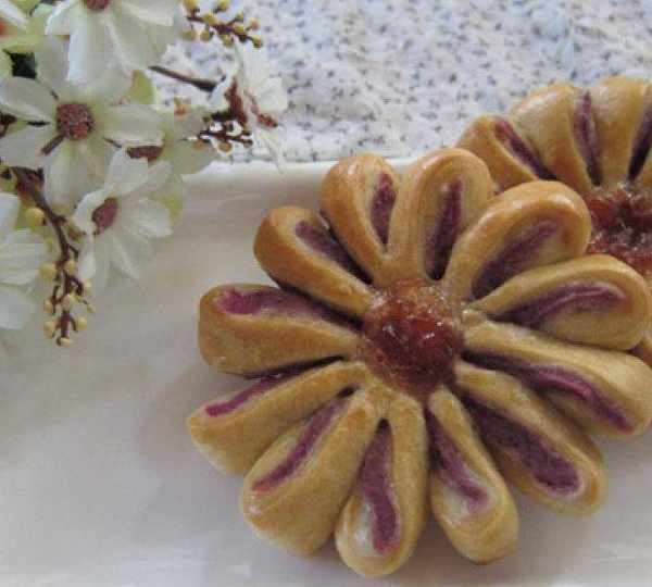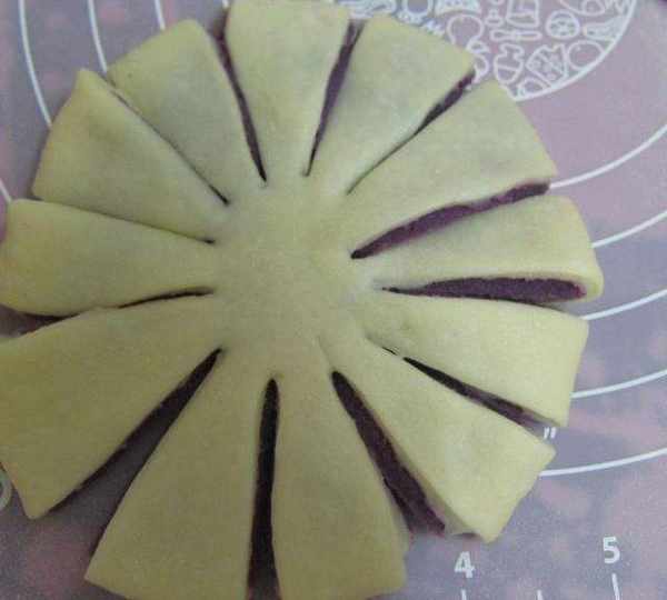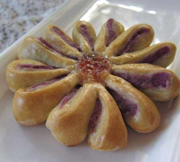 原料:高筋面粉、水、幹酵母、細砂糖、全蛋、黃油、鹽、紫薯、細砂糖。