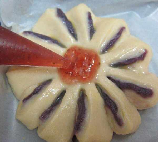 第10步、在面團中央擠上一點果醬,即可放入預熱好的烤箱烤焙。烤箱中層,上下火180度,15分鐘,至面包表面金黃即可出爐。