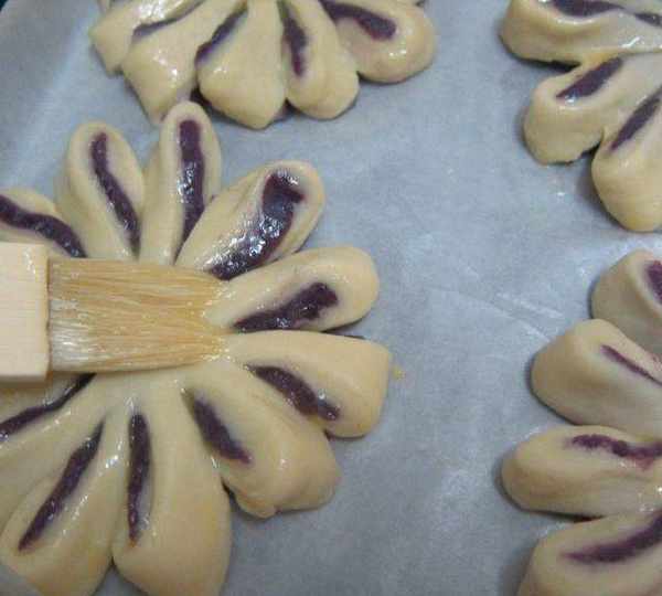第9步、將剪好的面團擺成花形,放在溫度為38攝氏度,濕度80%以上的環境下進行最後發酵,直到面團變成原來的2倍大。在發酵完成得面團表面刷一層全蛋液。