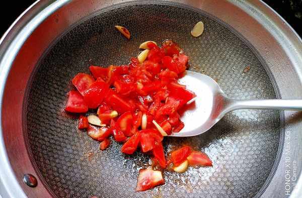 放入切好的番茄,放十三香、鹽適量翻炒。
