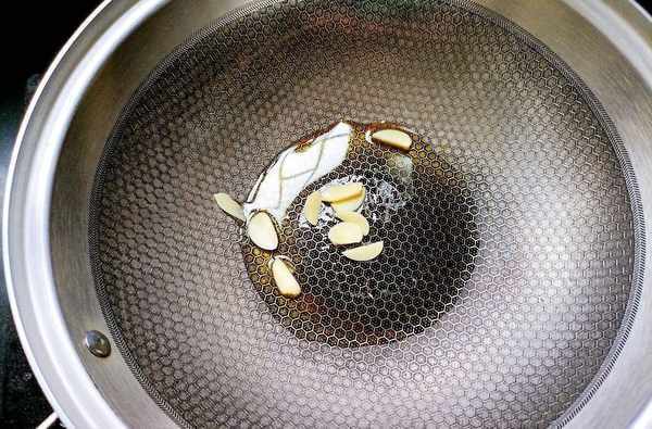 鍋中放入少量底油,放蒜片炒出香味。
